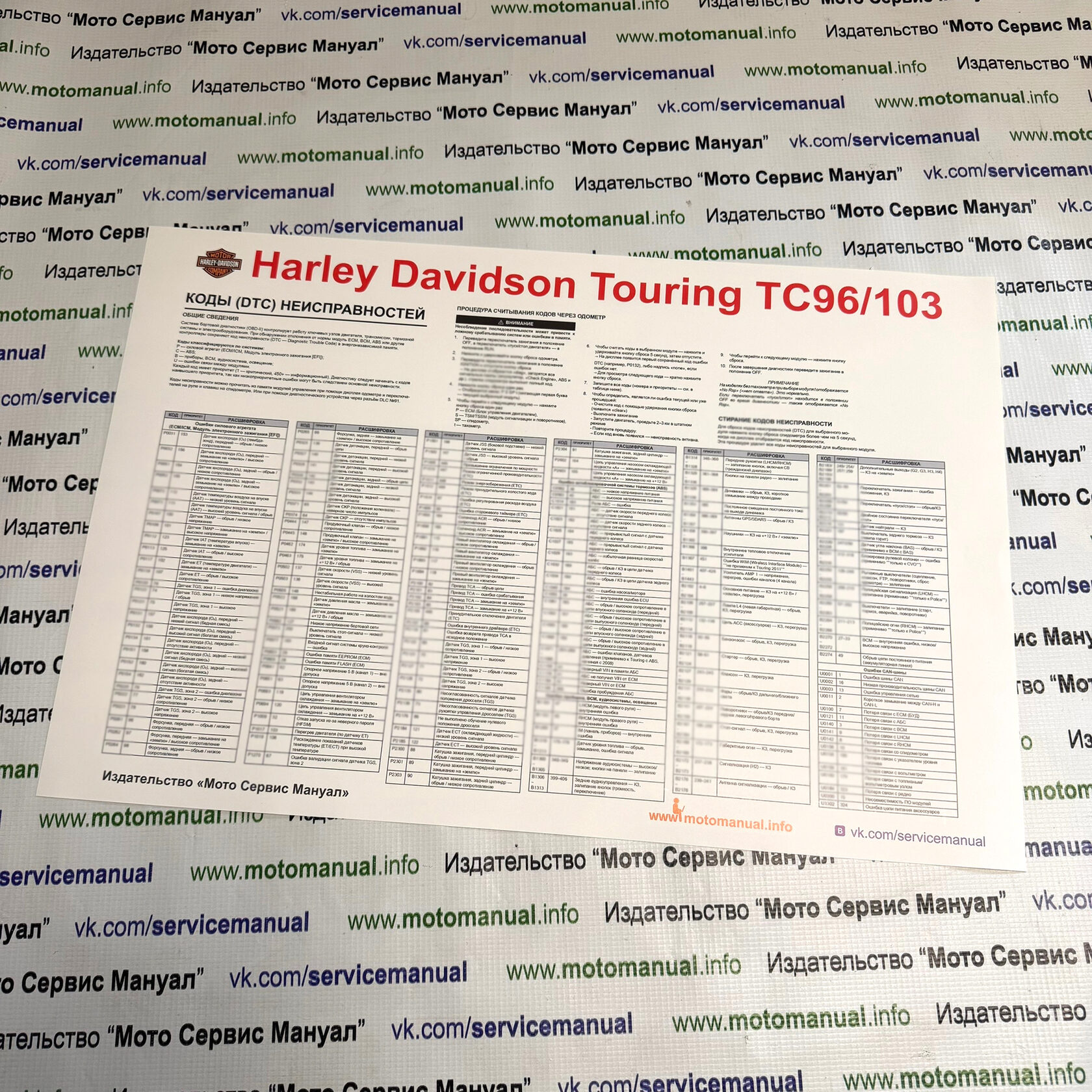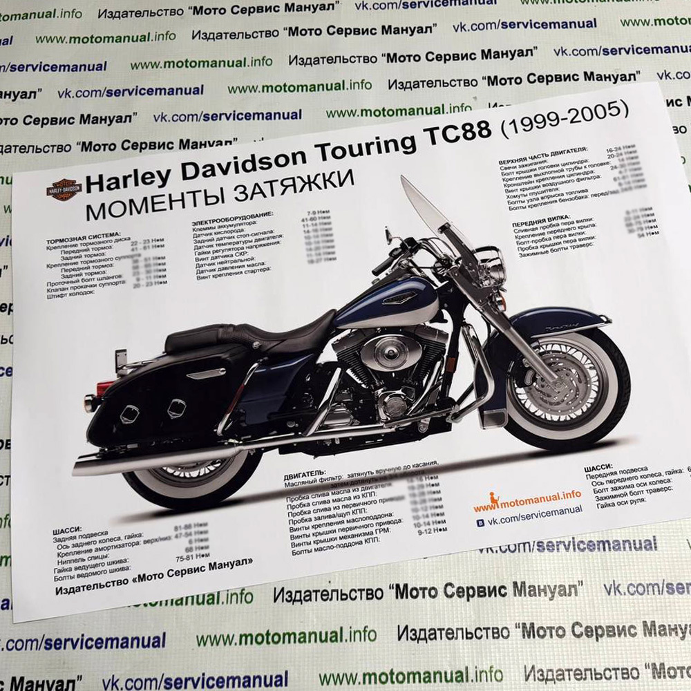 Сервисный (ремонтный) мануал на Harley Davidson Touring c двигателем ТС96 (2007-2012), размером 648 стр, включая 16 цветных выкидных электросхем. Книга подходит для модификаций: FLHR, FLHT, FLHX и FLTR. В руководстве по ремонту и обслуживанию описаны процедуры разборки, сборки и регулировки всех узлов мотоцикла, а также инструкции по поиску неисправностей. Это эксклюзивная компиляция двух мануалов в одну книгу. Такого нет в интернете. Книга продаётся только в напечатанном виде.