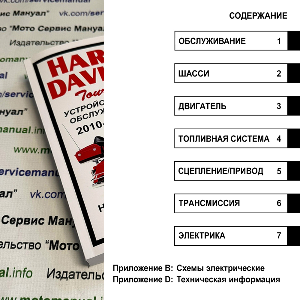 Сервисный ремонтный мануал на мотоцикл HARLEY DAVIDSON на русском языке. Руководство по ремонту и обслуживанию мотоцикла Харлей Давидсон. Книга по ремонту и обслуживанию мотоцикла содержит инструкции по разборке и сборке всех узлов мотоцикла, процедуры регулировки и поиска неисправностей, электросхемы