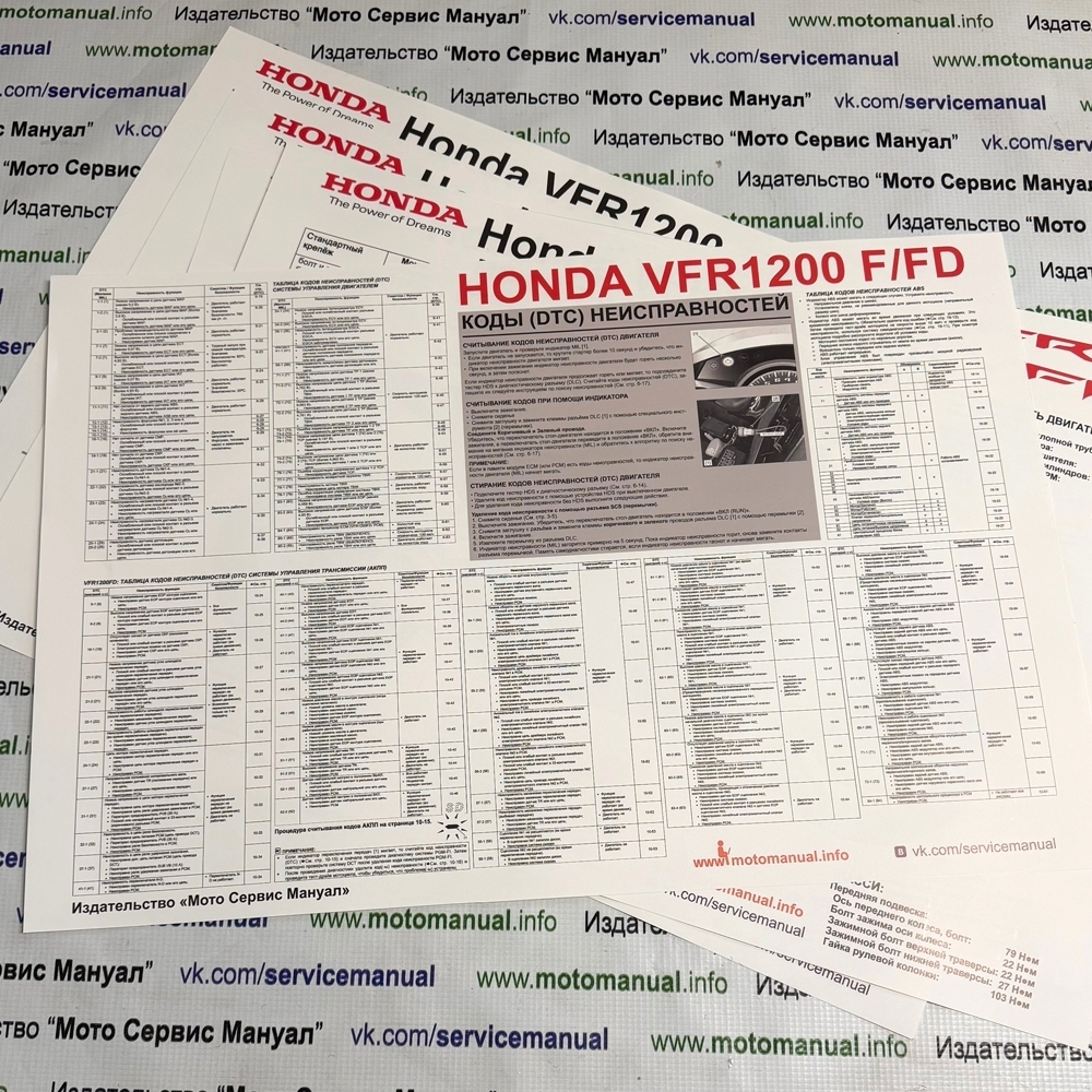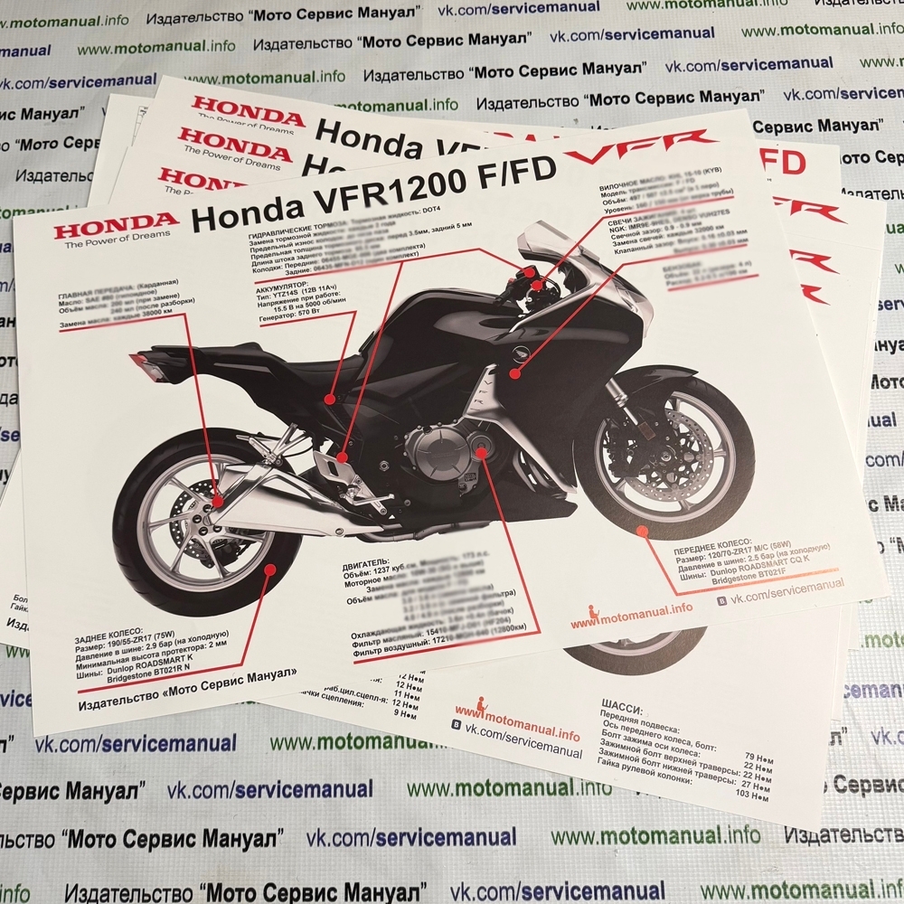 Дополнительные товары: 1. Плакат А2 "ТехноШпаргалка" (350 руб) 2. Плакат А2 "Моменты Затяжек" (350 руб) 3. Плакат А2 "Коды Ошибок" (350 руб) 4. Плакат А2 "ЭлектроСхема" 2 вида (350 руб) МКПП или АКПП 5. Нашивка "Хонда" с крылом 95х80 (350 руб) 3 вида 6. Нашивка "Хонда" без крыла 120х21 (300 руб) 7. Нашивка "VFR" 120х24 (300 руб) 8. Сервисный блокнот Хонда (300 руб) 9. Раскраска Мотоциклы (150 р)